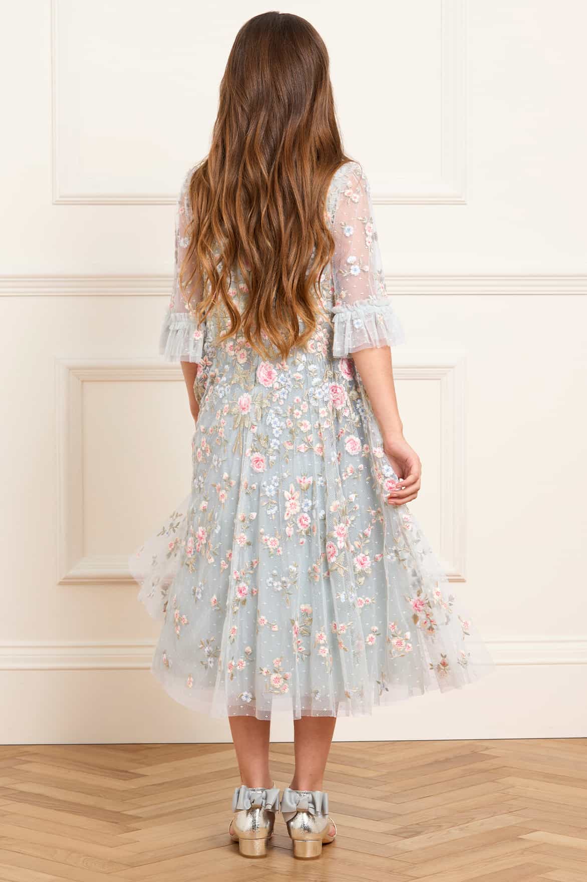 The Antoinettes Floral KIDS Dress in French Blue. Inspired by the opulent interiors of the Palace of Versailles, this enchanting dress features intricate multicoloured floral embroidery, with luxurious bouquets cascading delicately toward the hem. Designed with short fluted sleeves with frill cuffs and signature Needle & Thread tulle frills at the neckline and shoulders add romantic detail. The voluminous skirt, crafted from generous layers of net and tulle, is made for twirling—perfect for any special moment.