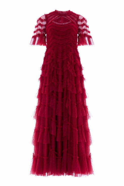 NEW SEASON. The Aviana Short Sleeve Gown in Red. Statement romance meets elegant ease. Featuring delicately gathered scallop frills arranged in flowing tiers, this version of the Aviana silhouette is balanced by short sleeves and a structured bodice. The bold red colour is perfect for making an entrance — a modern classic for festive evenings.