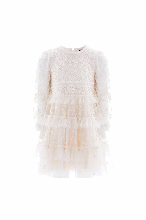 The Blossom Lace Kids Dress in Cream. This enchanting dress features intricate embroidery inspired by vintage lace, capturing timeless elegance with a delicate touch. The blouson sleeves with ruffle cuffs add soft volume, while gently gathered skirt tiers adorned with frills create beautiful movement. Finished with signature Needle & Thread frills at the neckline, shoulders, and waist, this piece is full of romantic, heirloom charm.