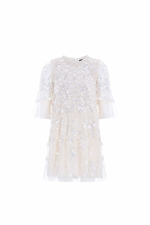 The Constellation Gloss KIDS Dress in Cream. This dress is decorated with an intricate sequin artwork inspired by the night sky. The loose, trapeze-shaped silhouette is adorned with crescent moons, shooting stars and constellations, for a charming all-over embellishment. Tiered tulle frills and voluminous sleeves complete the look with a special high-shine finish on the sequins, adding extra shimmer. Let your little one shine under the spotlight in the Constellation Gloss dress.