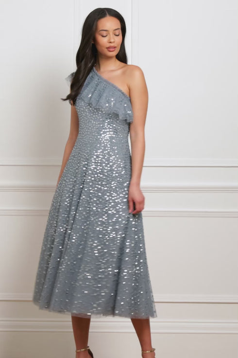 The Dappled Sequin One Shoulder Ballerina Dress in Thistle Blue. This ballerina dress is crafted in delicate tulle and designed with a romantic one-shoulder neckline, framed by soft, circle-cut frills. Intricately embellished with shimmering sequin clusters that gently scatter toward the hem, it catches the light with every movement. Chevron seaming sculpts the silhouette through the hips before falling into a full, frothy skirt of layered net and tulle with a graceful sweeping hem. Perfect for evening soirées, red carpet moments, and unforgettable celebrations.