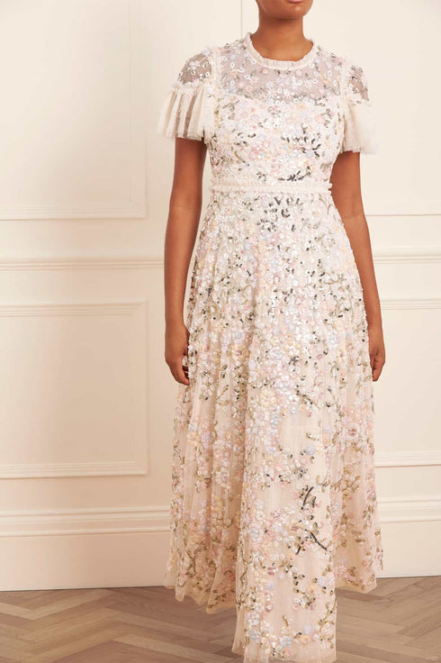 The Dream Garland Gloss Round Neck Gown in Cream. This embellished gown is beautifully scattered with high-shine sequins in a floral garland artwork inspired by an early 1900s illustration. Beautifully decorated with specially sourced ultra-shine sequins in pretty pastels. Developed with a generous, sweeping skirt made from layers of tulle and net to create a signature, statement look. The perfect style for an upcoming special occasion.