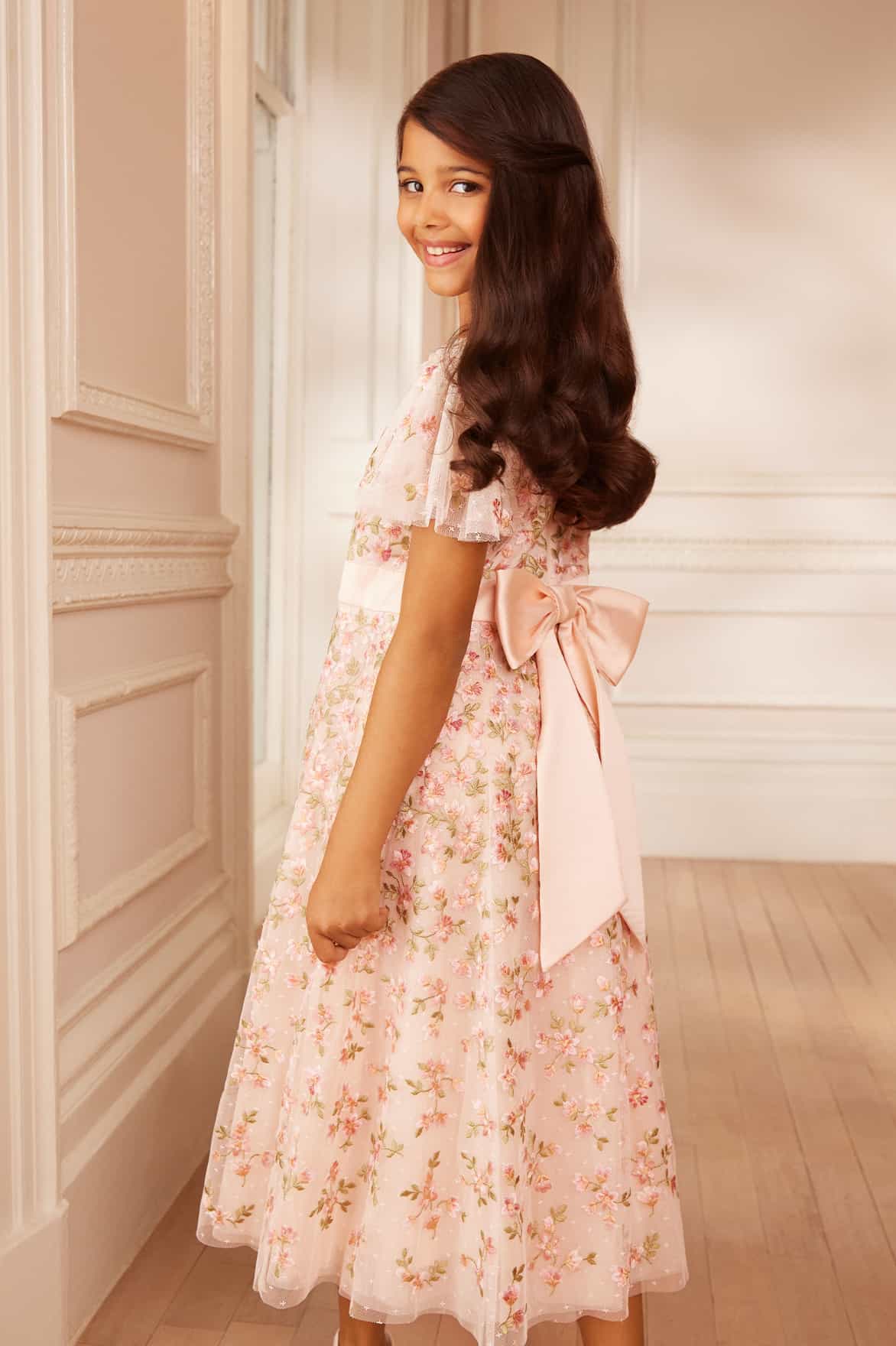 The Everett Bloom Kids Dress in Opal/Multi. This design is decorated with whimsical floral embroidery and crafted in soft layered tulle. The relaxed shape and soft colours make it ideal for unforgettable moments. Pairs beautifully with the women's Everett Bloom Gown from the AW25 collection.