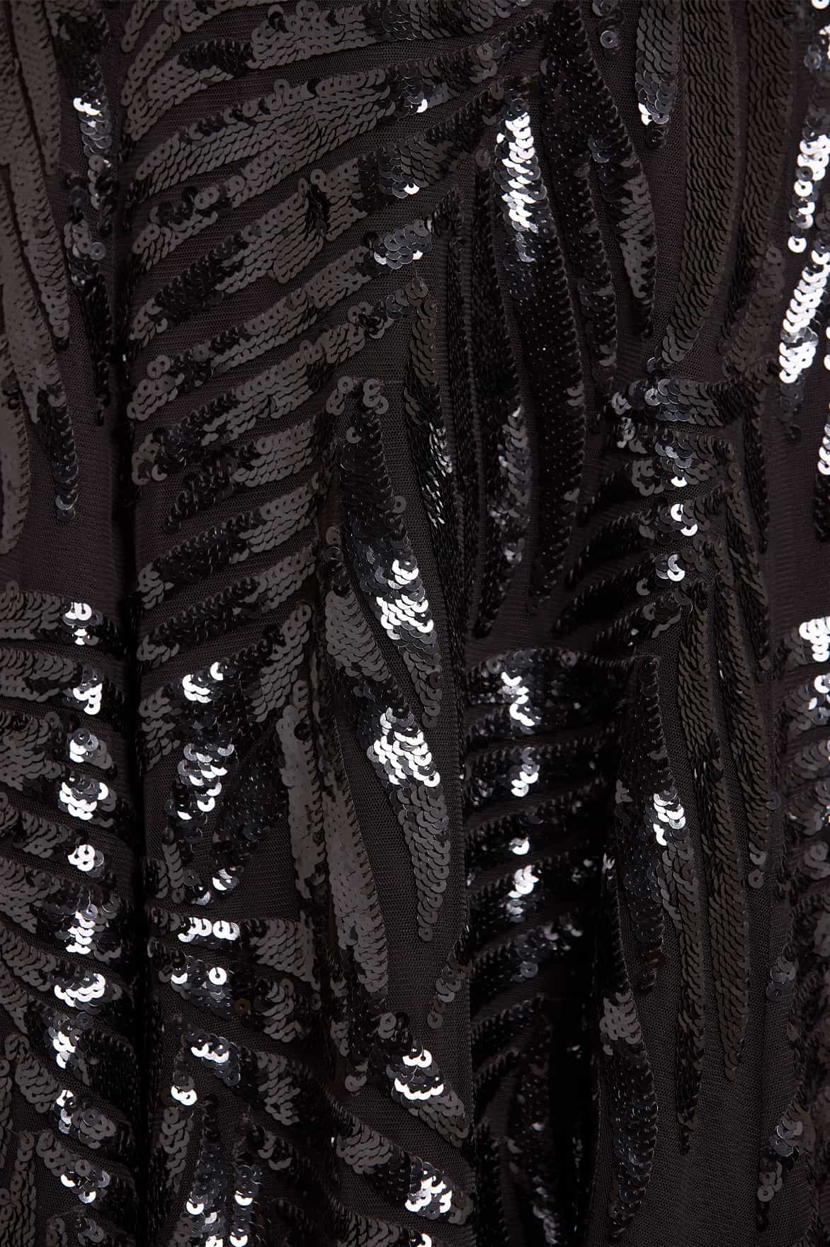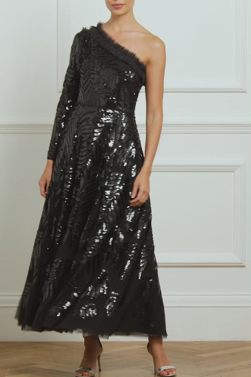 The Feather Sequin One-Shoulder Ankle Gown in Graphite. This show-stopping gown features statement feather sequin artwork inspired by costumes worn by the Follie’s dancers of the early 1900s. Beautifully designed with perfectly placed sequins gradually trailing towards the hem. Crafted with an elegant one-shoulder structure, slim sleeves and signature Needle & Thread tulle frills at the neckline and shoulder. The skirt is developed with generous layers of net and tulle for a sweeping hemline. The perfect gown for an upcoming special occasion and beyond.