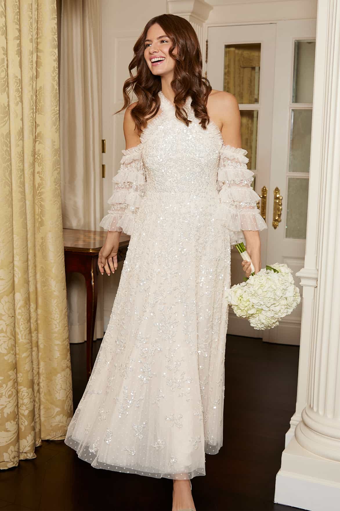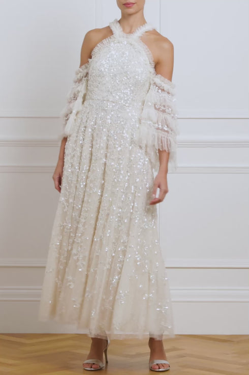 The Floral Lace Off-Shoulder Ankle Gown in Cream. This beautiful dress is embellished with tiny sequins in an overlapping linear formation depicting an exquisite floral design inspired by vintage lace from the early 1900s. The statement off-the-shoulder design has a flattering curved neckline and straps, adorned with signature Needle & Thread soft tulle ruffles. The fluted sleeves are decorated in frothy tulle ruffles and adorned with glittering sequins in floral motifs. The skirt is made up of generous layers of net and tulle with sweeping hemline. The perfect statement style for a special occasion.