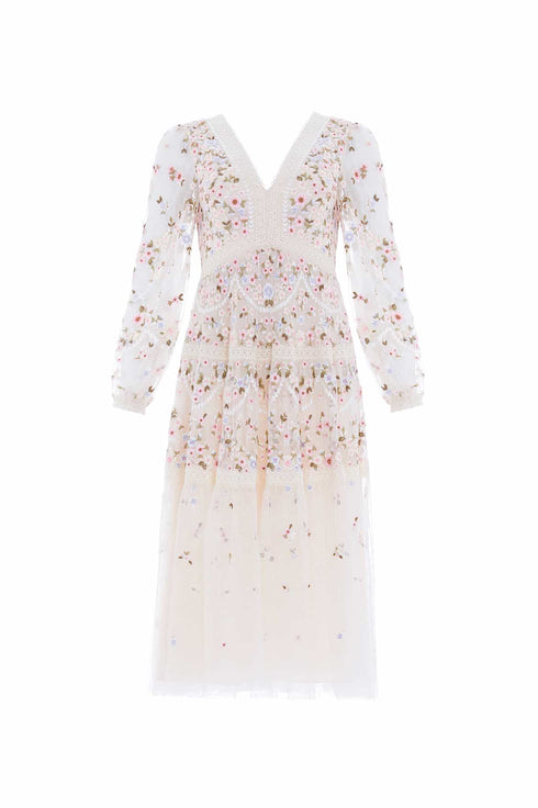 The Garland Ribbon Midaxi Dress in Cream. This embroidered dress is inspired by Victorian lace trims. Beautifully designed with floral embroideries in soft pastel tones. Developed with a V-shaped waist seam to create a flattering, effortless fit. This dress is adorned with intricate lace trims for signature Needle & Thread detailing. A pretty piece you'll forever treasure.