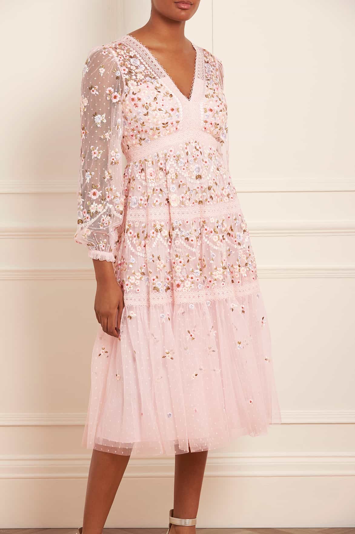 The Garland Ribbon Midaxi Dress in Peony Pink. This embroidered dress is inspired by Victorian lace trims. Beautifully designed with floral embroideries in soft pastel tones. Developed with a V-shaped waist seam to create a flattering, effortless fit. This dress is adorned with intricate lace trims for signature Needle & Thread detailing. A pretty piece you'll forever treasure.