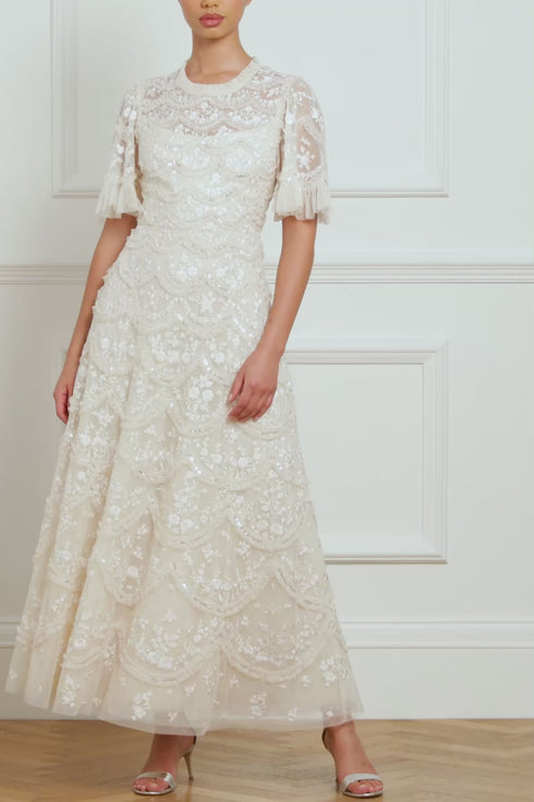 The Lily Bloom Ankle Gown in Cream. This ankle gown is beautifully designed with delicate tulle ruffles and soft scallop shaping for signature Needle & Thread styling. Adorned with intricate floral embroidery and trimmed with a high shine sequin adding shimmer throughout. Make the Lily your new wardrobe addition.