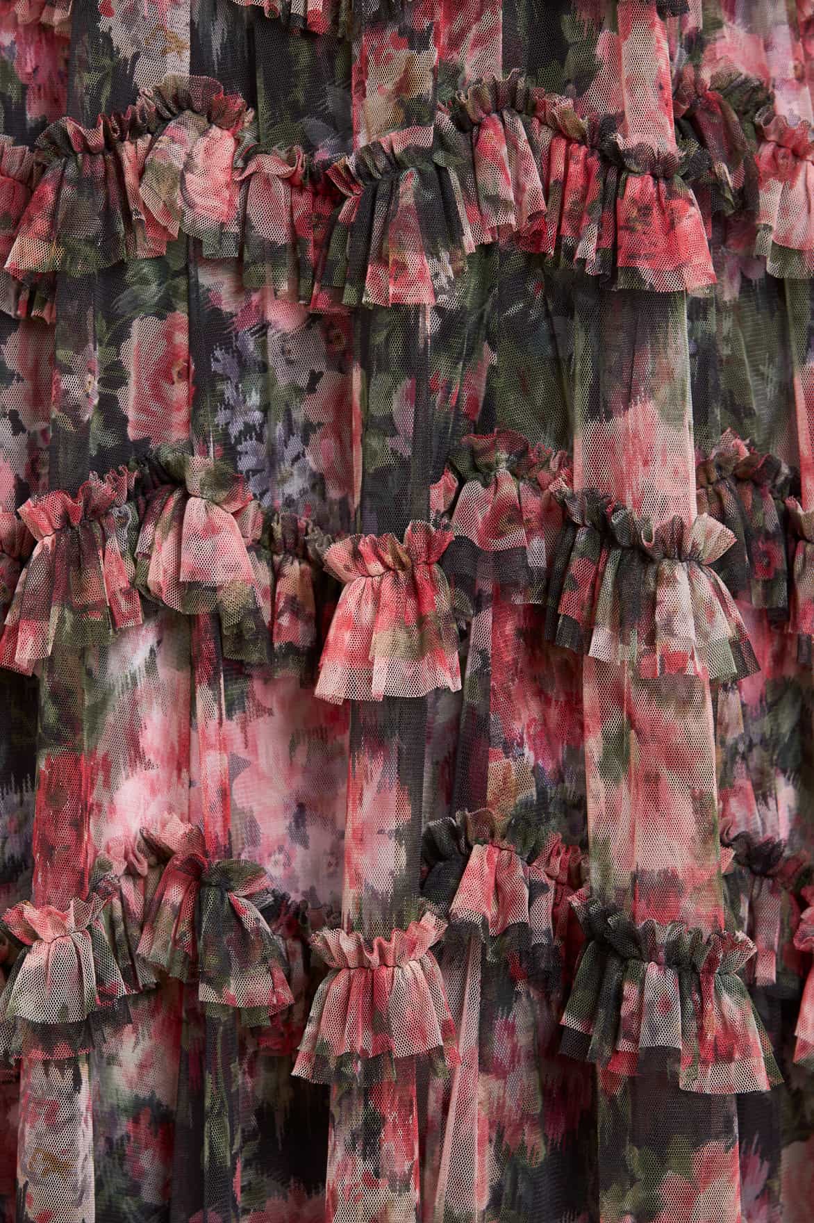 - Floral printed tulle decorated with floral printed tulle frills across the bodice, skirt and sleeve