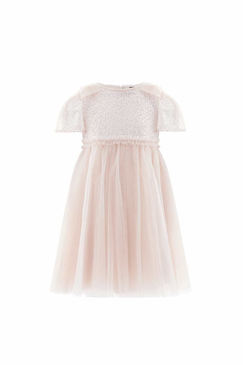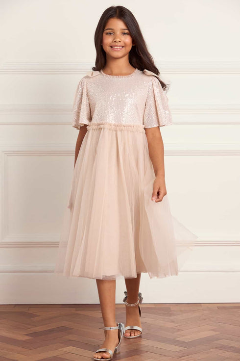 NEW SEASON. The Paloma Bow Kids Dress in Oyster. A sweet and romantic design with couture-inspired detailing. Crafted in layers of soft tulle, the dress features an oversized bow at the neckline for playful charm, balanced by a soft, flowing skirt. The oyster colour adds timeless delicacy. Pair with the Paloma Bow Gown in Oyster from the womenswear collection for an elegant family pairing.