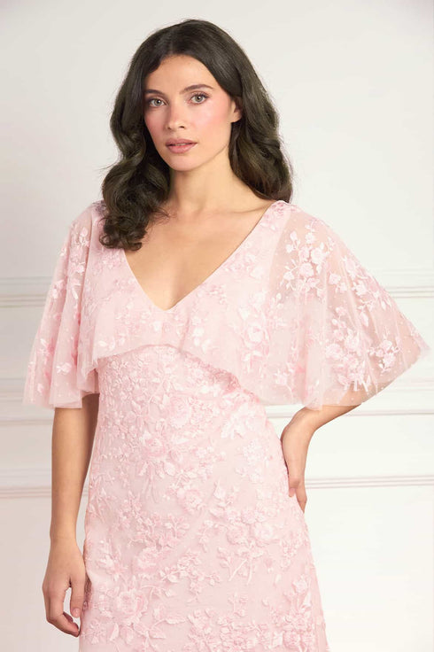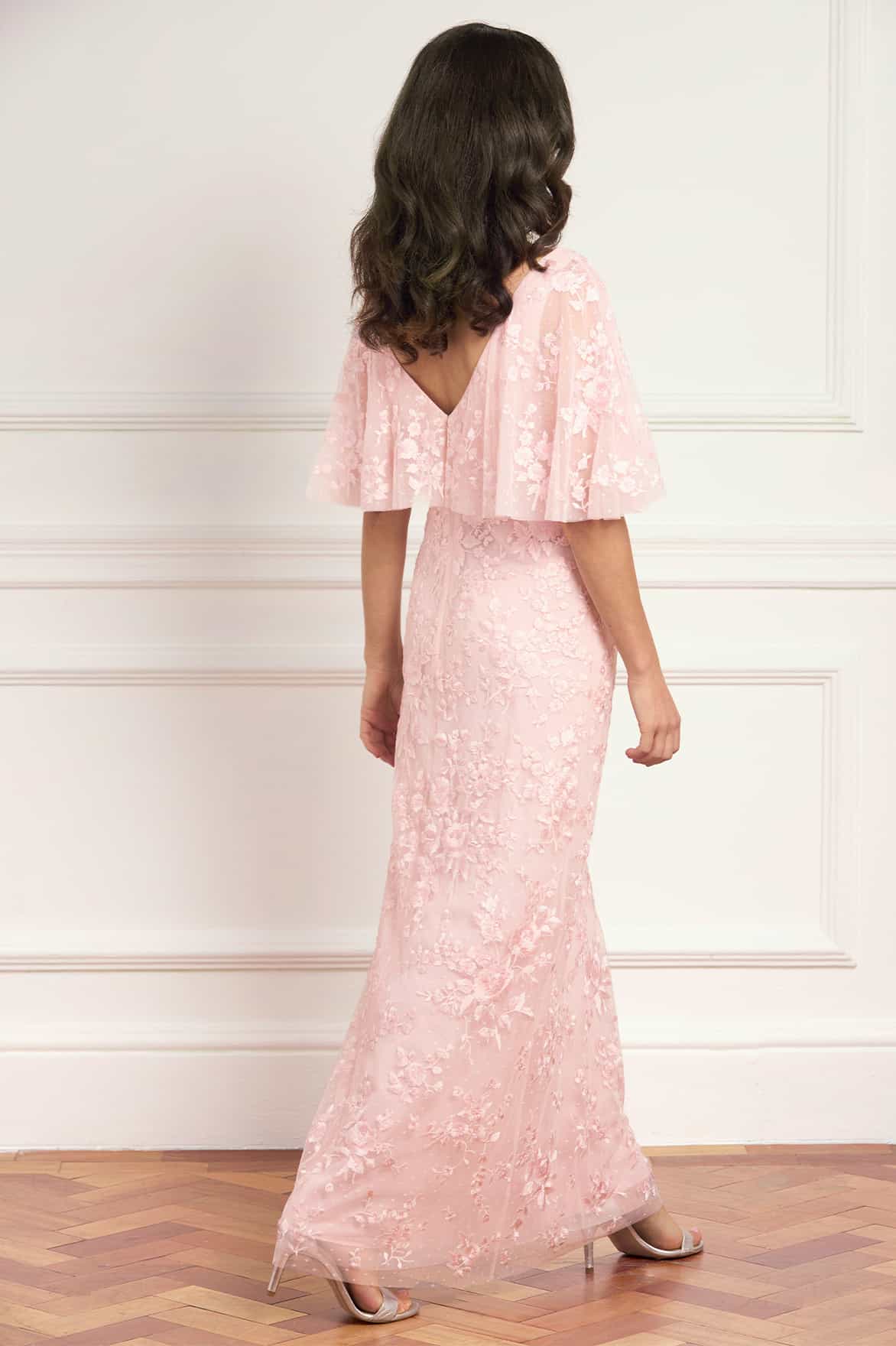 NEW SEASON. The Rosa V-Neck Cape Gown in Peony Pink. Adorned with delicate floral embroidery inspired by early 1900s artwork, this gown offers a refined, romantic silhouette. Finished with an integrated cape and a slim fit, enhanced by a bias-cut lining for fluid movement.