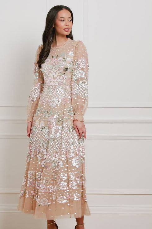 The Rosalie Ankle Gown in Butterscotch. This exquisite piece from Needle & Thread’s heritage collection is a masterclass in timeless elegance. The statement multicolour design is crafted from countless glittering sequins, artfully arranged in floral motifs within linear bands, accented with delicate dotted sequin and crosshatch details. Crafted with signature Needle & Thread tulle frills across the neckline and armholes, adding a touch of sophistication, while the blouson sleeves feature softly gathered elastic cuffs with refined frill edges. The skirt, composed of layers of luxurious soft tulle, flows effortlessly, creating a romantic and ethereal silhouette. This gown is the perfect embodiment of artistry, luxury, and timeless refinement.