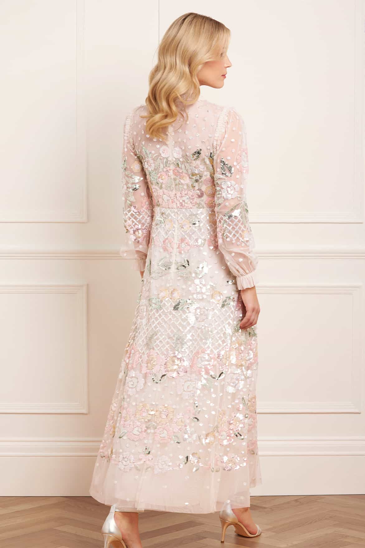 The Rosalie Ankle Gown in Cream. This exquisite piece from Needle & Thread’s heritage collection is a masterclass in timeless elegance. The statement multicolour design is crafted from countless glittering sequins, artfully arranged in floral motifs within linear bands, accented with delicate dotted sequin and crosshatch details. Crafted with signature Needle & Thread tulle frills across the neckline and armholes, adding a touch of sophistication, while the blouson sleeves feature softly gathered elastic cuffs with refined frill edges. The skirt, composed of layers of luxurious soft tulle, flows effortlessly, creating a romantic and ethereal silhouette. This gown is the perfect embodiment of artistry, luxury, and timeless refinement.