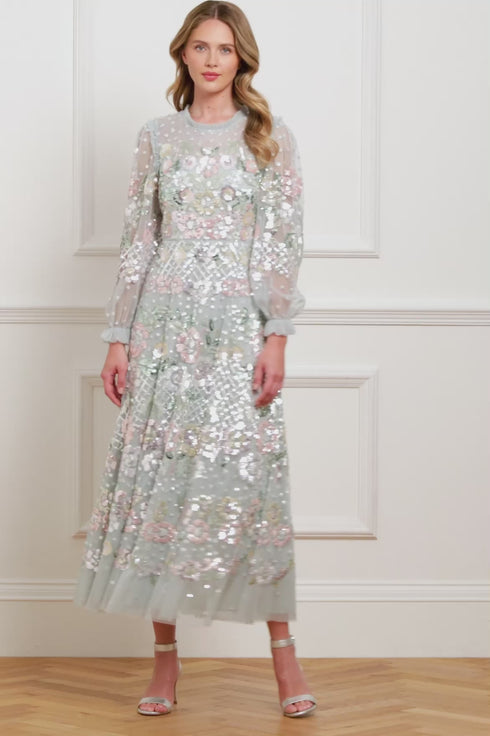 The Rosalie Ankle Gown in French Blue. This exquisite piece from Needle & Thread’s heritage collection is a masterclass in timeless elegance. The statement multicolour design is crafted from countless glittering sequins, artfully arranged in floral motifs within linear bands, accented with delicate dotted sequin and crosshatch details. Crafted with signature Needle & Thread tulle frills across the neckline and armholes, adding a touch of sophistication, while the blouson sleeves feature softly gathered elastic cuffs with refined frill edges. The skirt, composed of layers of luxurious soft tulle, flows effortlessly, creating a romantic and ethereal silhouette. This gown is the perfect embodiment of artistry, luxury, and timeless refinement.