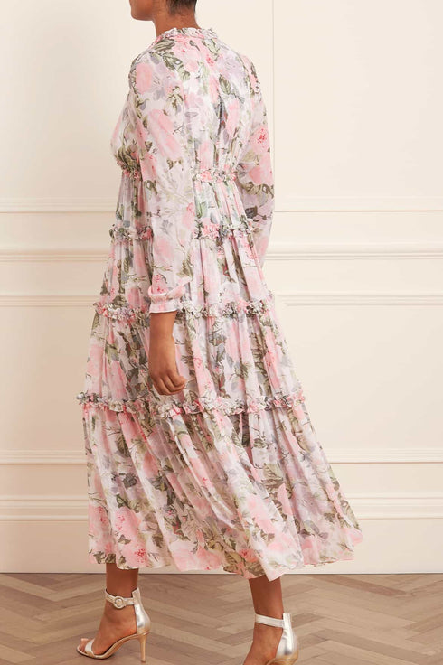 The Rose Powder Chiffon Ankle Gown in Moonshine. This gown is inspired by a 1900s hand-painted wallpaper design. Beautifully printed with florals in faded pastels for a vintage look. Developed with a soft chiffon fabric with a loose fitting silhouette for effortless styling. Designed with an upwards V-shaped waistline to create a flattering fit, gathered ruffles and skirt tiers for a signature Needle & Thread look. A versatile piece you'll forever cherish.