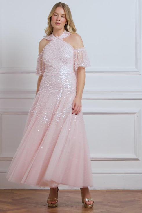 NEW SEASON. The Scallop Sequin Halter-Neck Ankle Gown in Seashell. Embellished with clusters of shimmering sequins forming a subtle scalloped design. Finished with a dramatic sash tie at the back, this halter style offers a refined, elongated silhouette perfect for evening occasions.