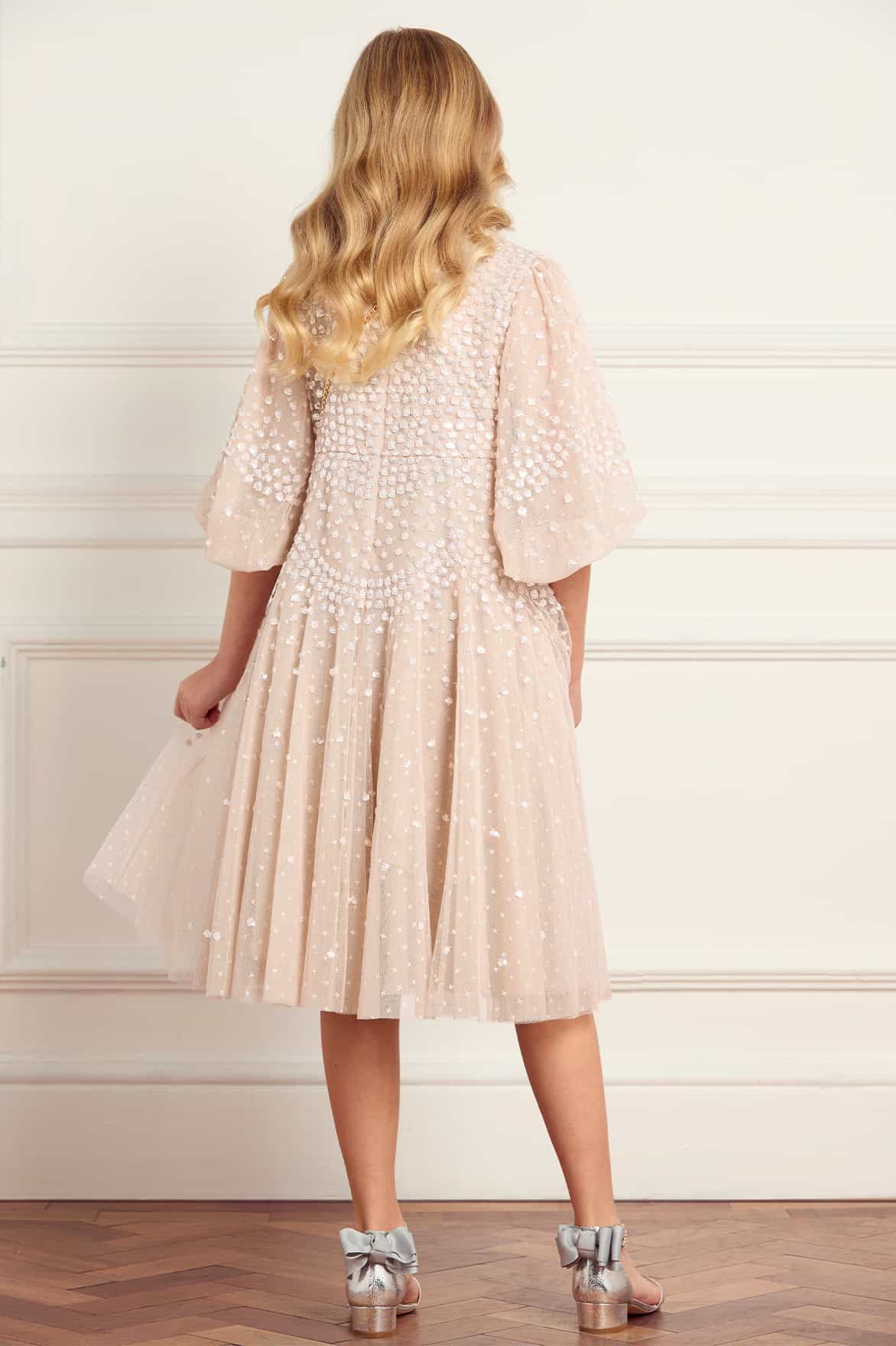 NEW SEASON. The Scallop Sequin Kids Dress in Oyster. A light, elegant piece crafted in layers of soft tulle. Sequin clusters form delicate scallop motifs across the bodice, adding shimmer and texture. The soft oyster shade makes it versatile and timeless. Designed to match the Scallop Sequin Round Neck Ankle Gown in Oyster from the womenswear collection, this dress completes a mother-and-daughter pairing.
