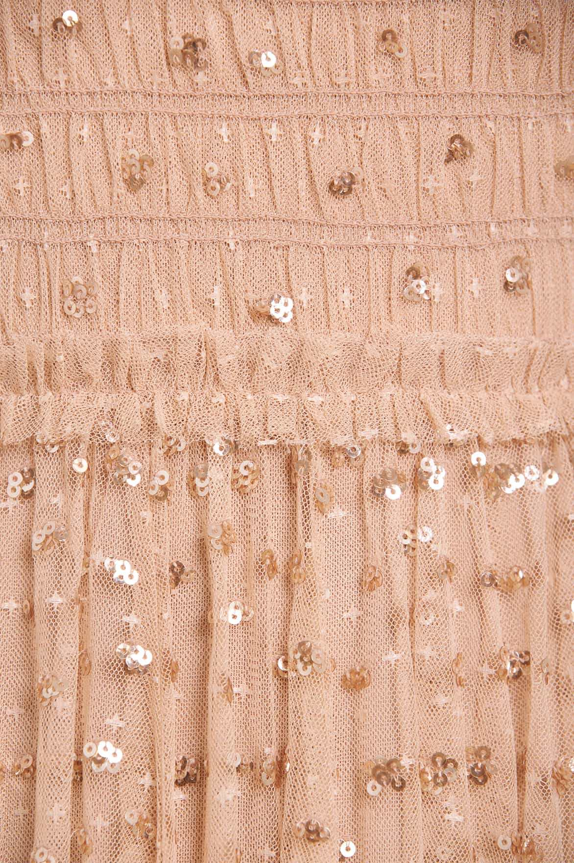 The Sequin Giselle Smocked Cami Ankle Gown in Butterscotch. This refined party gown features a scoop neckline, slim camisole straps, and a shirred bodice for a flattering fit. Signature Needle & Thread frills adorn the neckline and waist, while glittering sequin dot motifs cascade down the sheer, floaty skirt. Finished with an integrated power mesh bodysuit for comfort and support, this piece is a graceful blend of romance and sparkle—perfect for special occasions.