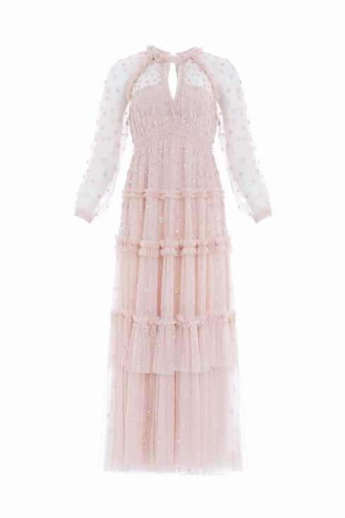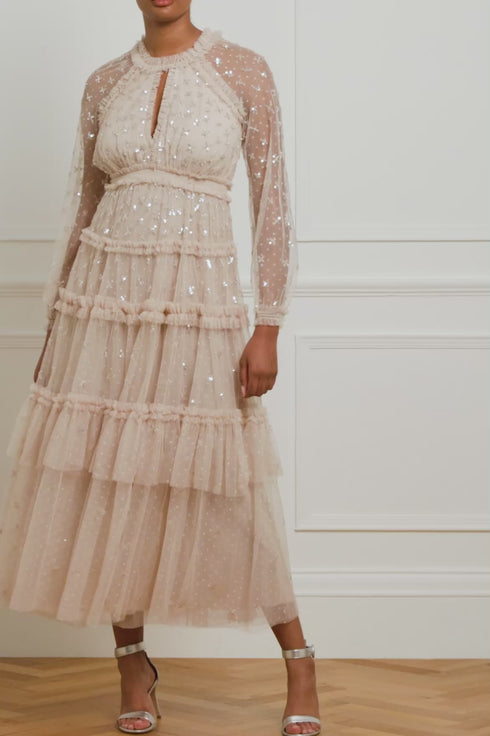 The Sequin Kisses Ankle Gown in Pebble. Beautifully adorned with intricate star motifs scattered throughout, creating an enchanting, shimmering effect. This flattering gown is developed with a smocked waist, long sleeves and tulle frill detailing. Designed with elasticated cuffs and a keyhole neckline for an effortless look. The perfect gown for an upcoming special occasion.