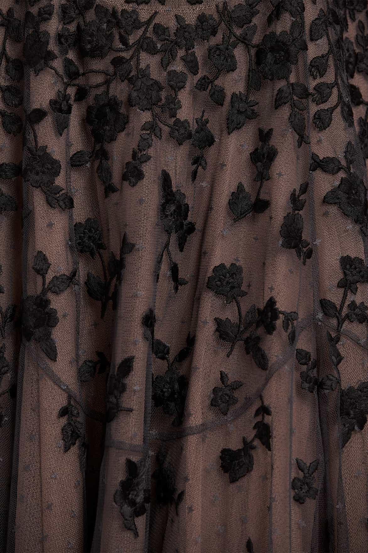 NEW SEASON. The Sylvia Rose Round Neck Ankle Gown in Graphite/Warm Taupe. Floral embroidery cascades into scattered motifs across airy tulle layers. The round neckline and slim cut are balanced by the moody graphite and taupe palette, grounding its femininity with sophistication.