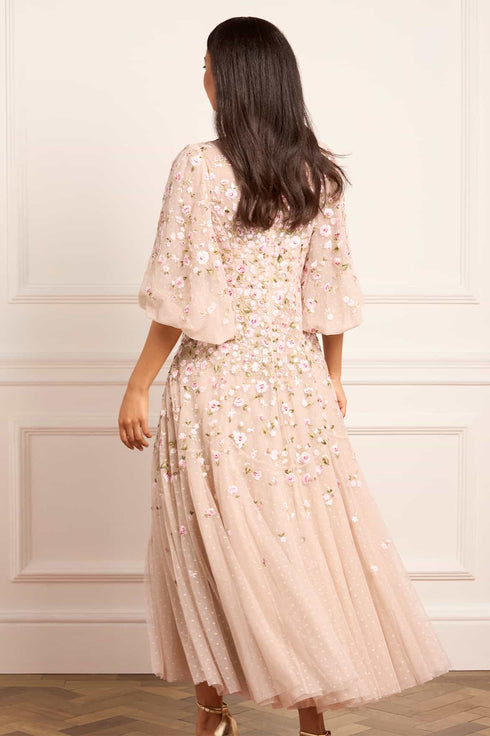 NEW SEASON. The Sylvia Rose Round Neck Ankle Gown in Oyster/Multi. Richly embroidered roses and scattered ditsy blooms adorn layers of tulle, softened by the luminous base. The gown’s slim silhouette and ankle length make it wearable yet impactful, while the multi-coloured embroidery evokes timeless artistry.