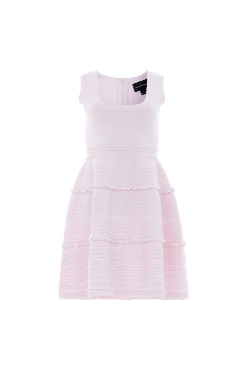 The Textured Knit Sleeveless Mini Dress in Pink. This knitted dress is intricately designed with scallop and pointelle trims for signature Needle & Thread detailing. Beautifully developed from a stretch, yarn fabric that makes the dress easy to wear and comfortable. This sleeveless dress is adorned with perfectly placed knitted ruffles, lace cable details and a voluminous skirt. Make this dress your new wardrobe staple.