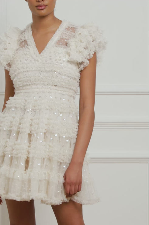 The Vivian V-Neck Micro Mini Dress in Cream. A signature Needle & Thread style statement. Beautifully printed with sequin polka dot motifs scattered throughout, creating an enchanting shimmer. Adorned with specially sourced sequins to create a sparkling effect throughout. This romantic style features tulle frills in perfectly positioned rows, creating a soft, frothy texture. Developed with generous ruffled sleeves and a V-neckline for a contemporary look. A style you'll wear time and time again.