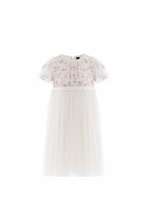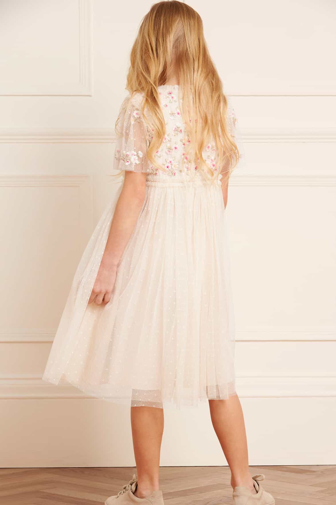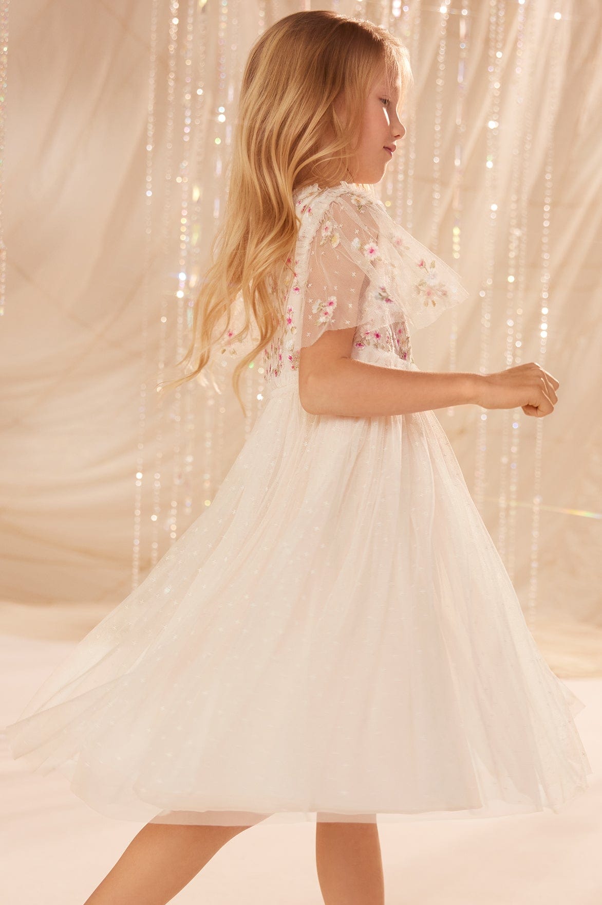 NEW SEASON. The Wildflower Ditsy Bodice KIDS Dress In Cream/Azalea Pink. The bodice of the dress is embroidered with floral motifs in soft, pastel shades inspired by floral garden paintings. Developed with a soft tulle skirt creating playful movement as she walks. Let your little one twirl around in the Wildflower at her next event.
