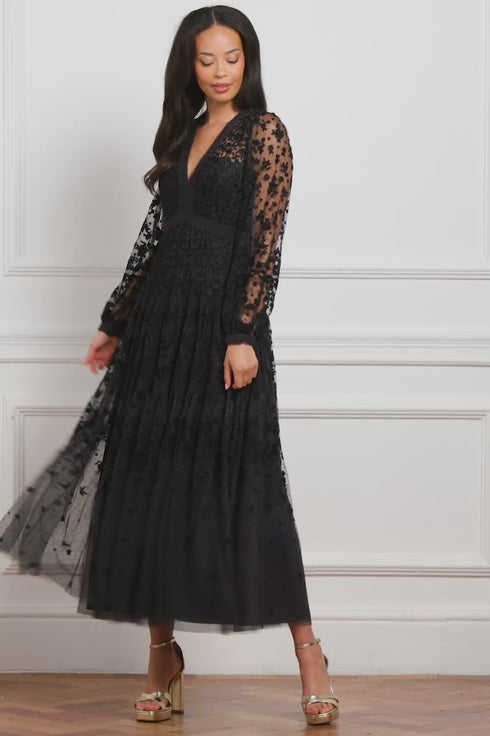 NEW SEASON. The Celestia Ribbon Ankle Gown in Graphite. Inspired by the intense romance of Keat’s Bright Star poem, this gown reflects the stars that dance across the night sky, shimmering with sequin trail motifs and twinkling dot accents. The moody graphite palette lends edge to its romantic silhouette, making it ideal for evening events under candlelight or stars.