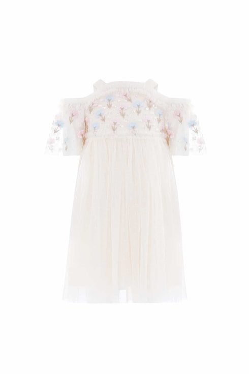 NEW SEASON. The Dandelion Ditsy Bodice Off-Shoulder Kids Dress in Cream. Features delicate floral embroidery scattered across soft tulle. With a ruffled neckline and floaty skirt, this sweet silhouette captures the joy of twirling and little celebrations.