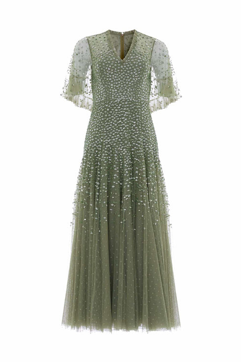 The Dappled Sequin Cape Ankle Gown in Fern. A graceful romantic design, this ethereal gown features an integrated cape with softly gathered frill detailing, adding fluid movement and a touch of drama. Crafted with delicate clusters of shimmering sequins intricately scattered across the fabric, creating a light-catching, dappled effect. Designed with signature Needle & Thread tulle ruffles framing the neckline, while chevron seaming sculpts the waist and hips before falling into a voluminous, frothy skirt. Crafted from generous layers of net and tulle, this gown is destined for truly unforgettable moments.