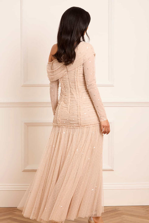 The Gigi Dot One-Shoulder Rouched Gown in Beige. A sculptural yet soft silhouette featuring delicate dotted tulle. The one-shoulder bodice is detailed with gentle ruching, while the skirt flows with subtle volume. An elegant choice for elevated evening events.