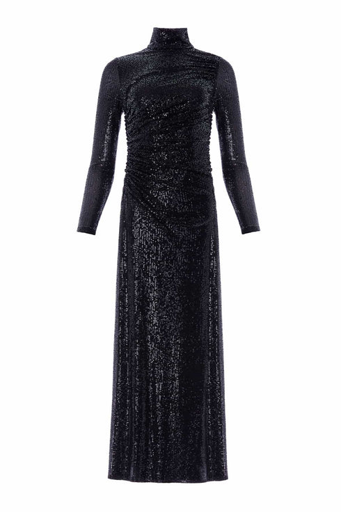 NEW SEASON. The Malia Turtleneck Ankle Gown in Graphite. A sleek silhouette defined by its high neckline and long sleeves evokes Victorian modesty, while the fluid skirt recalls night skies in motion. The graphite palette lends sophistication and drama, creating a gown for evenings steeped in romance.
