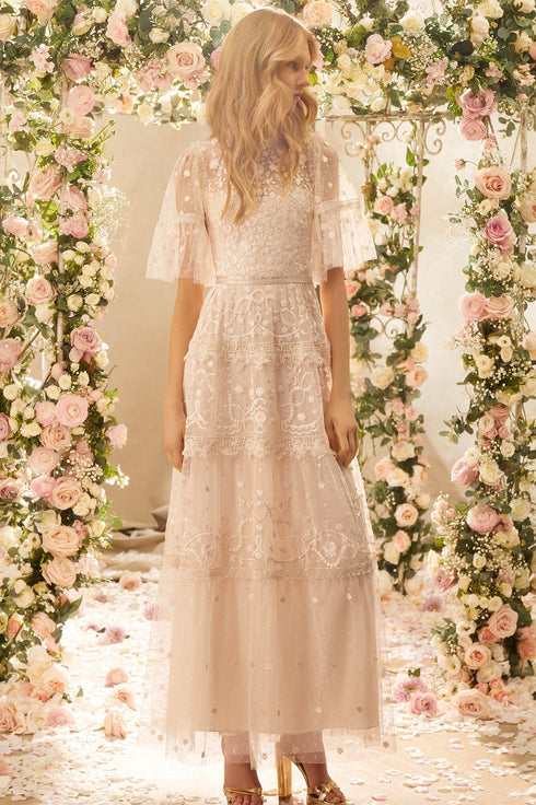 The Midsummer Lace Round Neck Gown in Champagne. A signature Needle & Thread style, with an updated neckline for the Taking inspiration from Victorian lace, the Midsummer features intricately embroidered artwork in tonal colours on delicate tulle. Beautifully developed with lace frills framing each tier of the skirt. This embroidered lace gown has sheer, romantic sleeves and our signature grosgrain ribbon at the waist. The perfect gown to take you from day to night.
