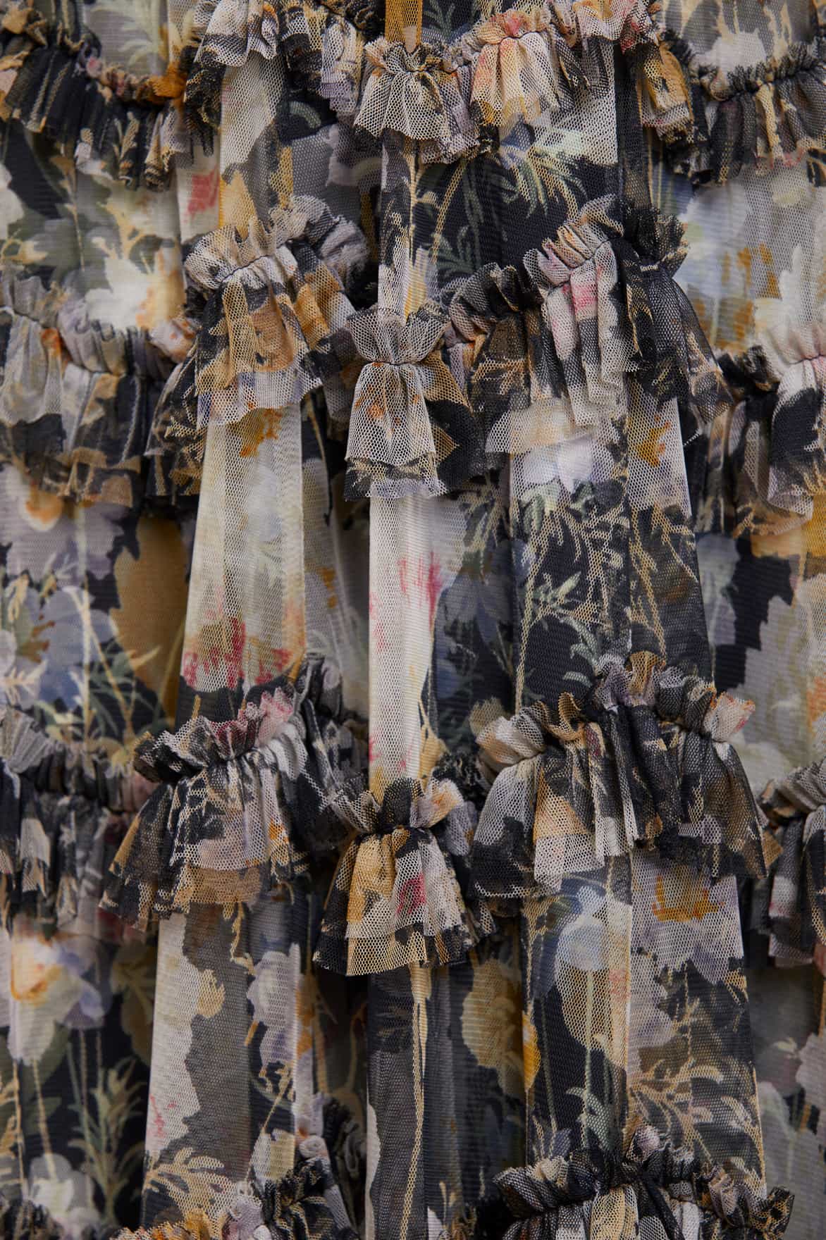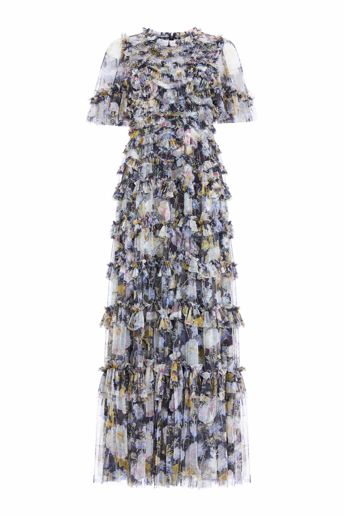 The Moonlight Petals Round Neck Gown in Graphite. The print of this gown is taken from a 1900's hand-painted artwork. Beautifully printed with soft white peonies and silvery blue wildflowers creating an enchanting print. Crafted with signature Needle & Thread detailing featuring delicate tulle frills, scallop shape borders and frills creating romantic texture throughout. You can dress the Moonlight up or down depending on the occasion.