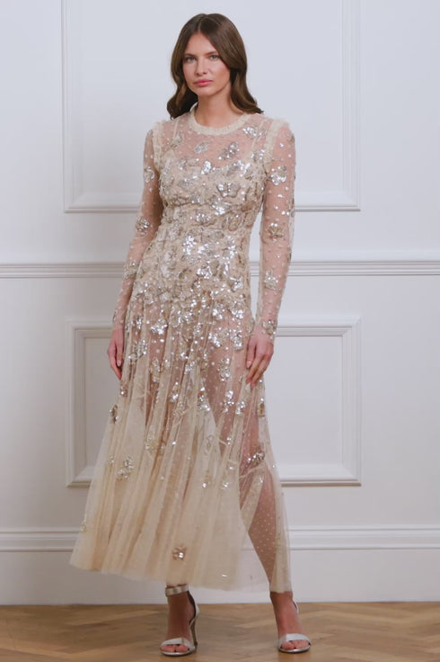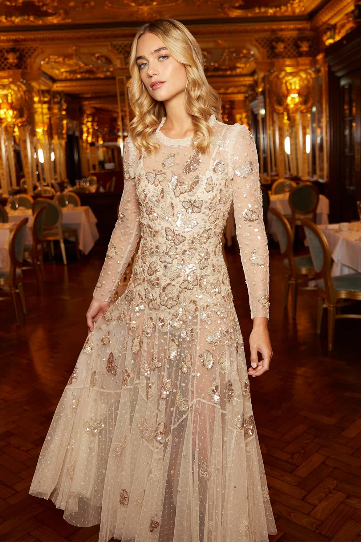 The Papillon Sheer Ankle Gown in Parchment, inspired by the 1900s French ballet La Papillon, features glittering butterfly motifs that trail delicately towards the hem. Decorated with high-shine sequins, enhanced with a glossy foil coating, add extra lustre. This sheer gown includes an integrated stretch scoop-neck bodysuit and slim sleeves adorned with butterfly and glittering dot motifs. The round neckline is finished with signature Needle & Thread tulle frills. Make a statement in this enchanting showstopper.