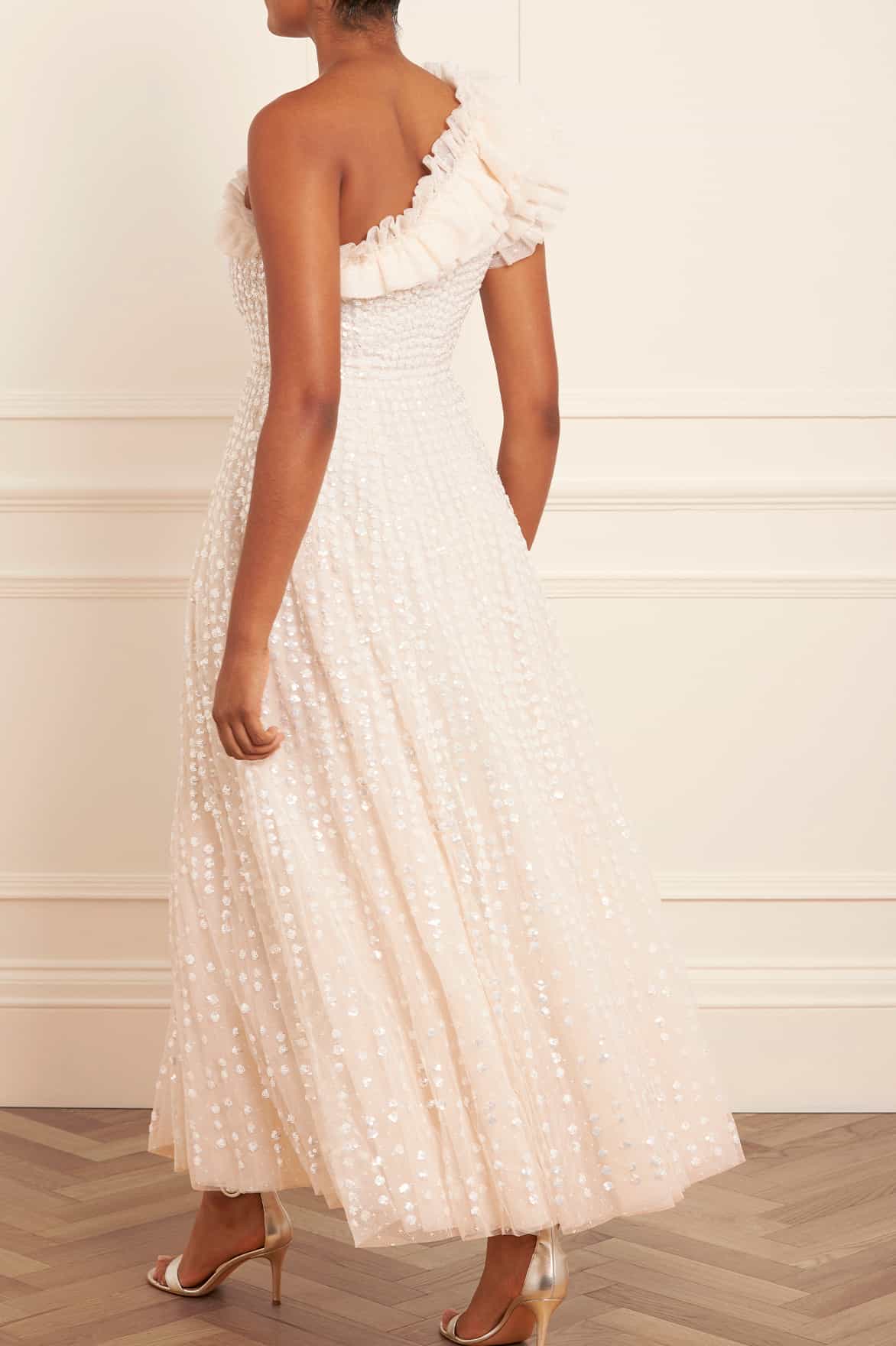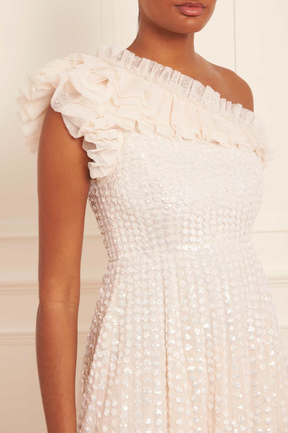 The Raindrop One Shoulder Ankle Gown in Cream / Cream. This gown is beautifully adorned with an enchanting sequin artwork. The artwork is designed with delicate shimmering polka dot sequins in a linear formation capturing the essence of glistening raindrops. Designed with an off-the-shoulder style for elegant detailing. The skirt is made from layers of frothy tulle featuring statement frill details, creating a signature romantic look. The gown is perfect for an upcoming special event.