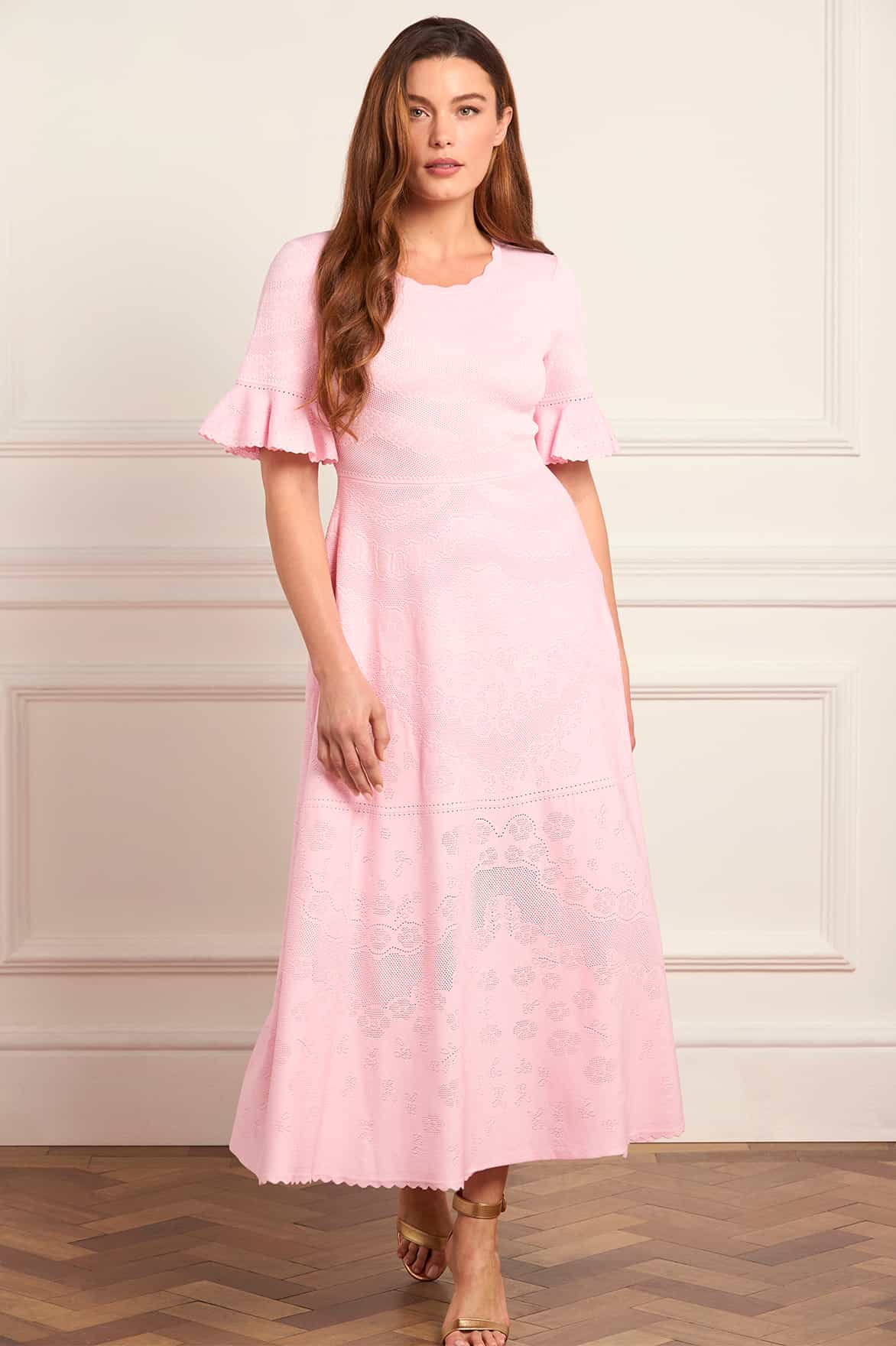 NEW SEASON. The Scallop Lace Pointelle Knit Gown in Seashell. A graceful knit design with a scalloped neckline and soft lace detailing. Combining delicate craftsmanship and fluid drape, it offers a modern twist on timeless romance.
