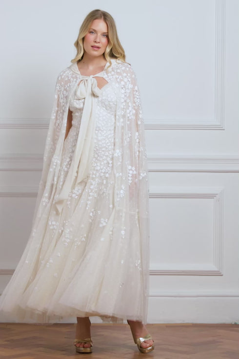NEW SEASON | NEEDLE & THREAD EXCLUSIVE. The Scatter Blossom Hooded Long Cape in Cream. An enchanting piece adorned with delicate ditsy embroidery. Designed with a softly draped hood and floor-length silhouette, this exclusive cape adds ethereal charm to any occasion look.