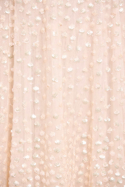 The Scatter Dot Ruffle Ankle Gown in Cream. This gown features shimmering dot motifs that fade towards the hem for a captivating glittering effect. The sequins have a high-shine finish, enhanced by a foil coating. Designed with a tulle frill edge on the neckline, while layered tulle sleeves add volume. The voluminous skirt, made from net and tulle, creates a sweeping hemline. This enchanting gown is perfect for any special occasion.