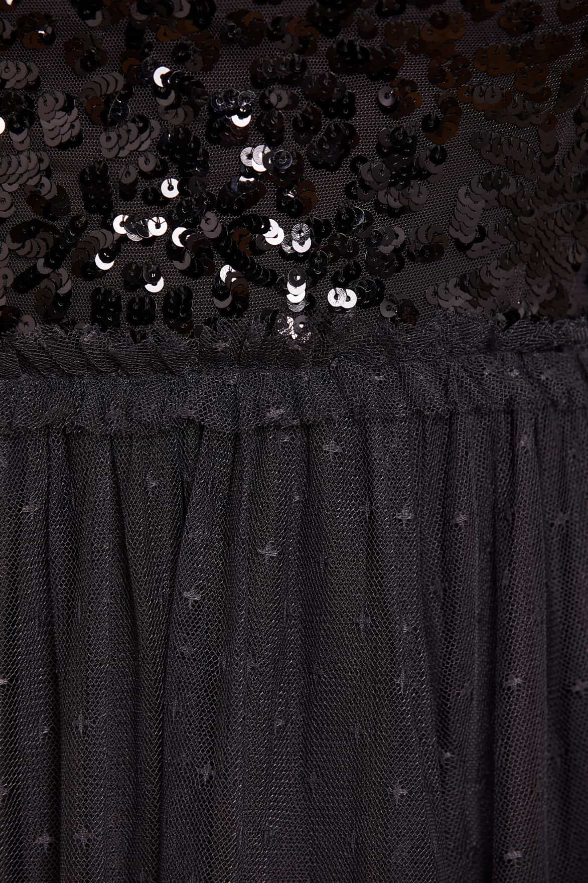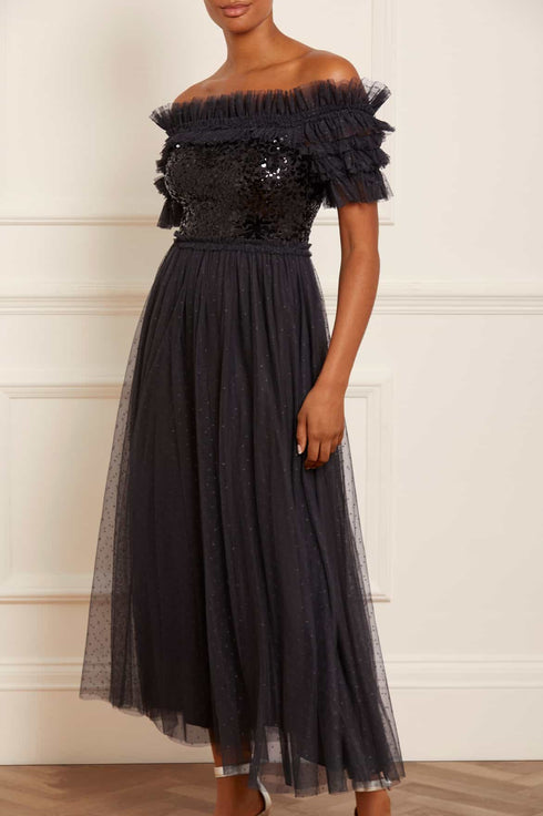 The Sequin Wreath Bodice Off-Shoulder Ankle Gown in Graphite. This beautiful gown is crafted with an iconic off-the-shoulder design. Adorned with layers of delicate ruffles, along with an elasticated panel for comfort and hold. The bodice is beautifully decorated with shimmering sequins inspired by a vintage lace curtain. Designed with a romantic layered tulle skirt for signature Needle & Thread styling. A perfect gown for a special occasion.