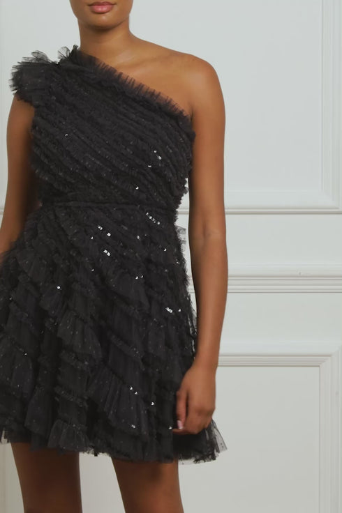 The Spiral Sequin One Shoulder Micro Mini Dress in Graphite. A brand new style for the season ahead. This dress is elegantly crafted with a one shoulder design. Beautifully engineered with gathered, spiral texture and intricate, shimmering sequins adorning each individual frill creating an enchanting effect. Beautifully adorned with delicate tulle frills and a layered tulle skirt for a frothy, romantic texture. We hope you love the spiral sequins as much as we do.