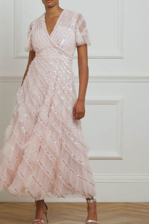 The Spiral Sequin V-Neck Ankle Gown in Peony Pink. A brand new style for the season ahead. This gown is a true statement piece, featuring all over frothy texture to create a signature Needle & Thread look. Beautifully engineered with gathered, spiral texture and intricate, shimmering sequins adorning each individual frill creating an enchanting effect. Make an appearance in this romantic style.