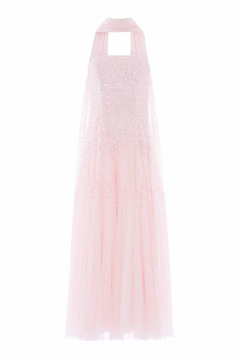 NEW SEASON. The Sunrise Sequin Strapless Cape Gown in Peony Pink. An elegant strapless gown adorned with softly shimmering sequin detailing inspired by glowing sunrise hues. Finished with a delicately gathered tulle cape at the back and a flowing full-length skirt for dramatic occasionwear. Perfectly paired with a matching scarf.