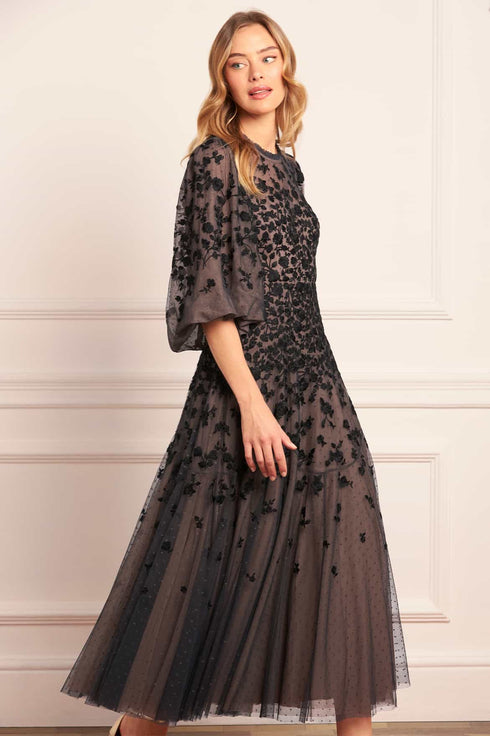 NEW SEASON. The Sylvia Rose Round Neck Ankle Gown in Graphite/Warm Taupe. Floral embroidery cascades into scattered motifs across airy tulle layers. The round neckline and slim cut are balanced by the moody graphite and taupe palette, grounding its femininity with sophistication.