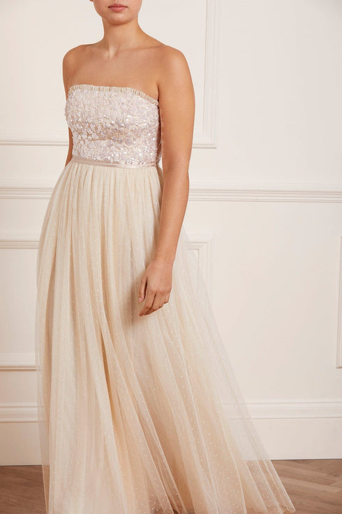 The Tempest Strapless Corset Bodice Gown in Champagne/Pink. The bodice of this gown is embellished with shimmering, iridescent sequins in romantic floral lace motifs. Designed with an integrated corset made with ribbon stitching, soft boning and panels of stretch mesh fabric for comfort and security in the fit. Crafted with layers of signature kisses tulle creating romantic movement as you walk. A true fairytale piece in the collection.