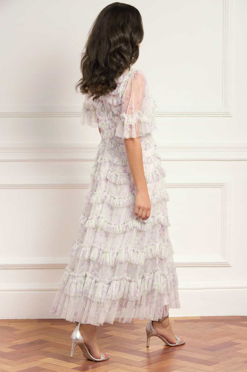 NEW SEASON. The Trailing Floral Round Neck Ballerina Dress in Moonshine/Powder Lilac. This romantic ballerina-length dress is adorned with trailing floral artwork inspired by painted garden scenes. Finished with a round neckline and softly flowing skirt for light, feminine movement.