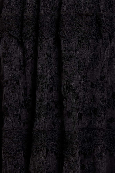The Araminta Lace Gown in Graphite / Black. This signature Needle & Thread style is designed with an intricately embroidered artwork. Beautifully adorned with lace trims, a layered tulle skirt and a romantic silhouette. The perfect gown for a special upcoming occasion.
