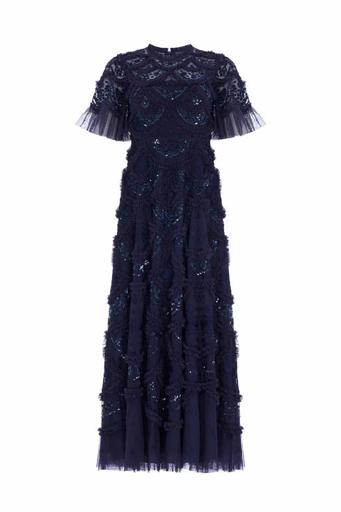 The Carmen Ruffle Ankle Gown in Navy Blue. Delight in a vision of true romance with the Needle & Thread Carmen Ruffle Ankle Gown. With expert craftmanship, the soft layers of tulle and exquisite embroidery evokes a sense of a timeless beauty. Layers of gently ruffled tulle create our signature Needle & Thread textured look, so that you can show off a dazzling silhouette. With floral vine borders and glistening sequins, you can be sure that our romantic Carmen Ruffle Gown will be a show stopping piece in your wardrobe.
