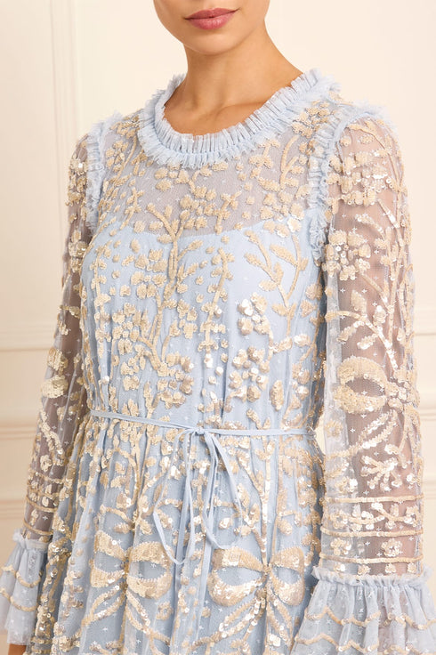 The Celia Long Sleeve Ankle Gown in Dusk Blue/Gold. This statement gown is designed with romantic artwork featuring ornate florals and ribbon bows, densely embellished with shimmering sequins for exquisite detailing. Crafted with an effortless loose fit with soft, playful tulle frills on the hem and cuffs. A key piece in our collection.
